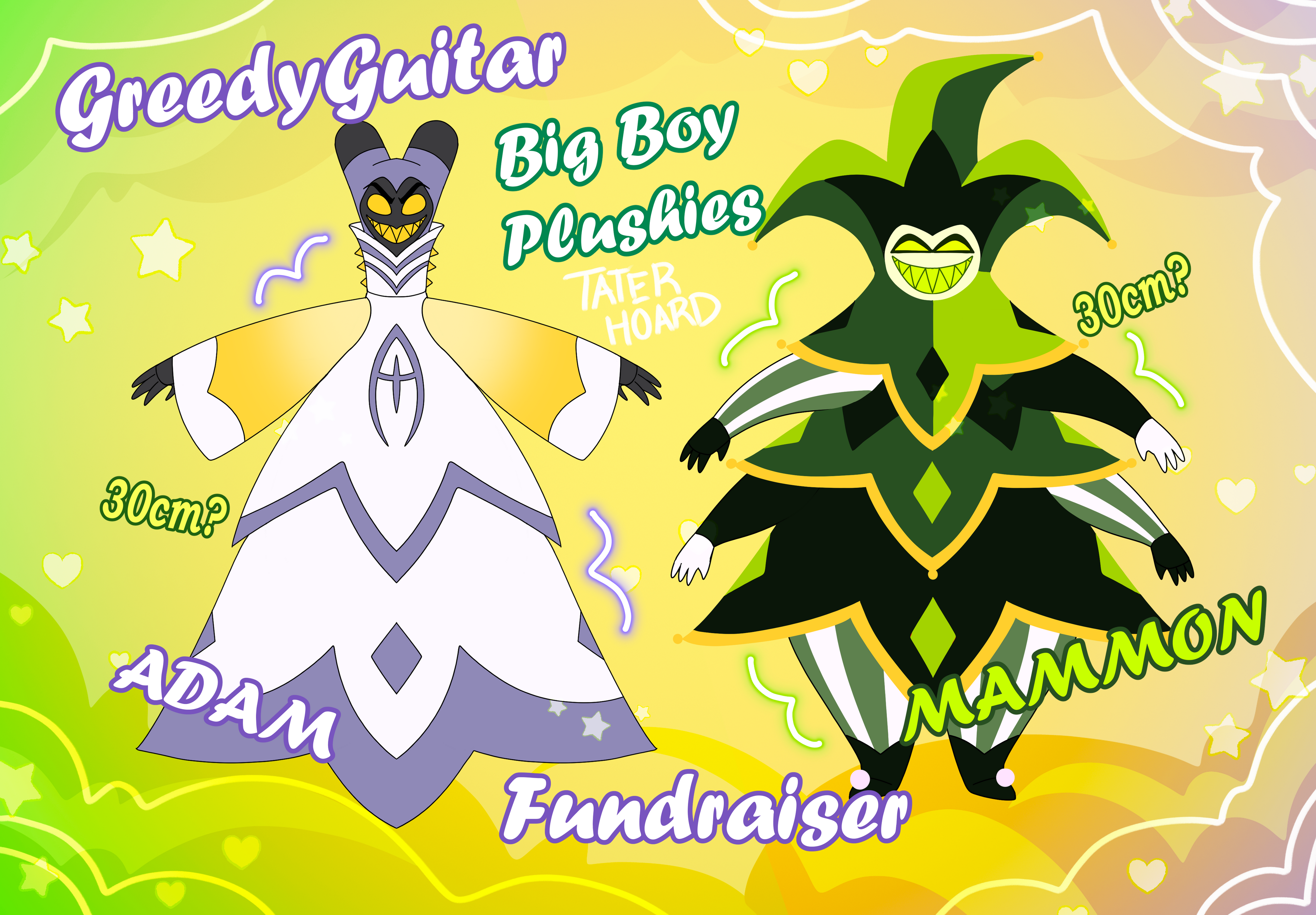 Hello everyone my name is potato and I would like to introduce you all to the Big boy plushies! These plushies are large versions of the helluverse characters Adam and Mammon. I have tried my best to break down their design as much as possible to make it easier to have these guys turned into plushies. We are doing our best to make this a reality and id love to be able to hug our favorite nasty guys for real! Please check out our socials for any updates on the fundraisers